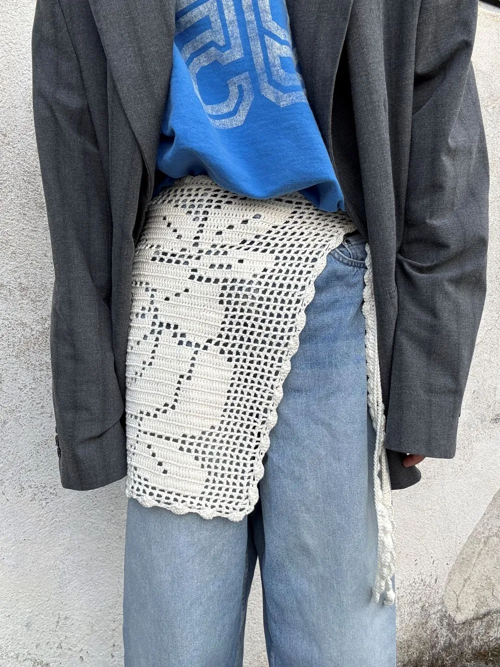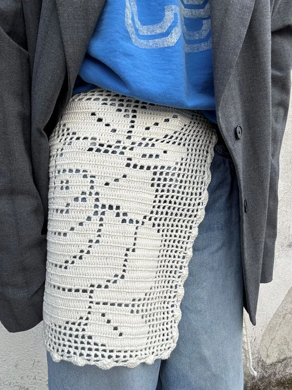 The Flower Apron Skirt is crocheted from the bottom up. It is made using double crochet stitches and chain stitches.